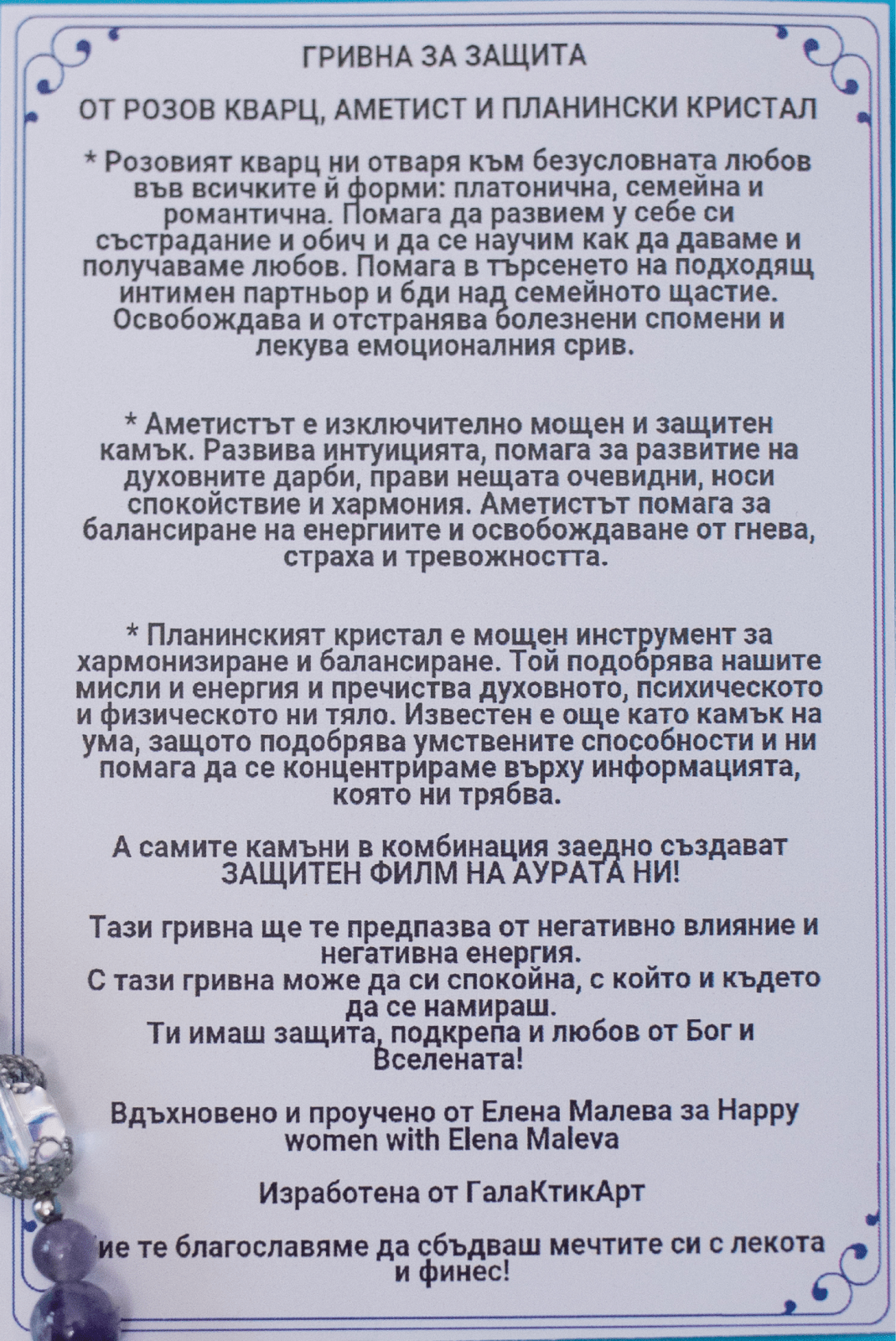 С тази гривна може да си спокойна с който и където да се намирате Ти имаш защита, подкрепа и любов от Бог и Вселената!